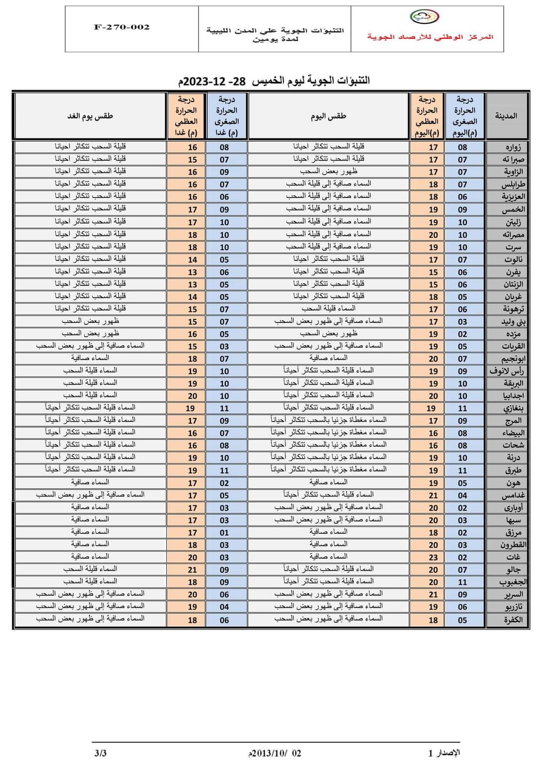 حالة السماء صافية إلى قليلة السحب تتكاثر على غدامس والمناطق المجاورة لها مع احتمال سقوط أمطار خفيفة ومتفرقة.