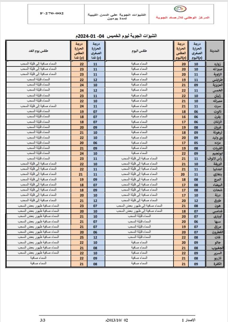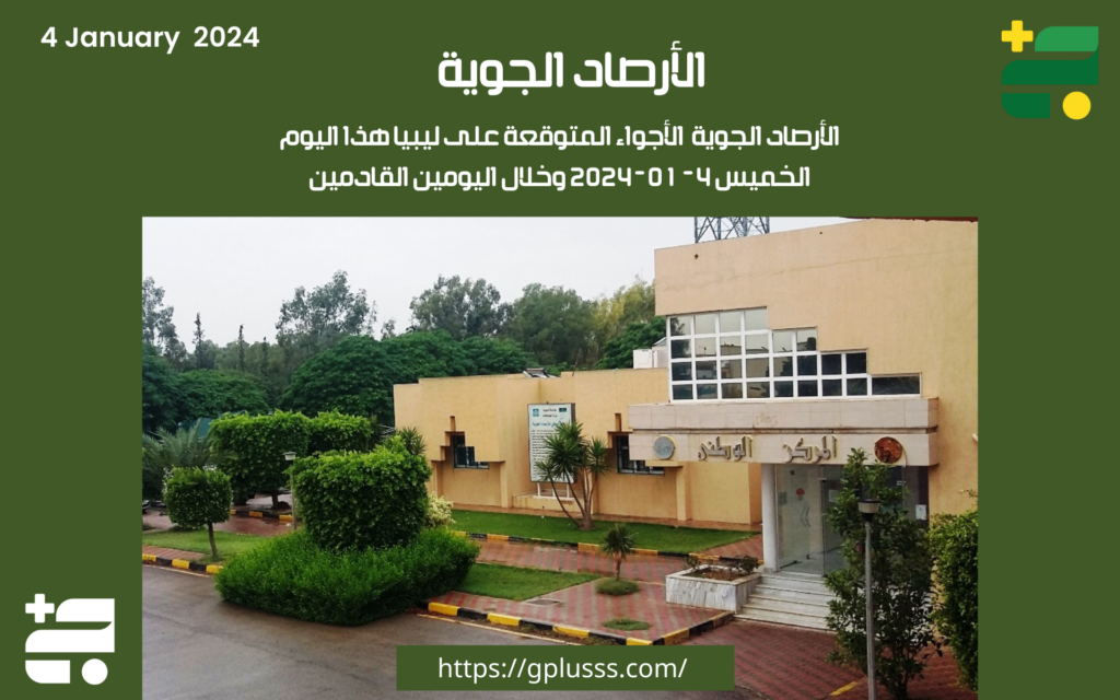 نشر المركز الوطني ل الأرصاد الجوية تفاصيل الأحوال الجوية المتوقعة على ليبيا خلال الأيام الثلاثة القادمة، بدايةً من اليوم الخميس 4 يناير 2024.