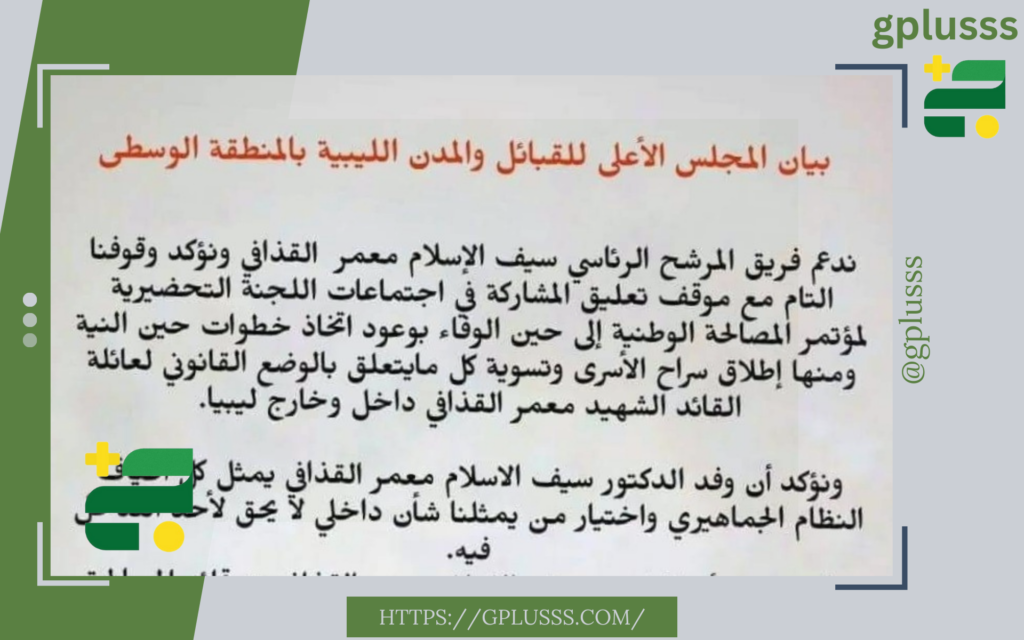 ندعم فريق المرشح الرئاسي سيف الإسلام معمر القذافي ونؤكد وقوفنا التام مع موقف تعليق المشاركة في اجتماعات اللجنة التحضيرية لمؤتمر المصالحة الوطنية إلى حين الوفاء بوعود اتخاذ خطوات حين النية، ومنها إطلاق سراح الأسرى وتسوية كل مايتعلق بالوضع القانوني لعائلة القائد الشهيد معمر القذافي داخل وخارج ليبيا.