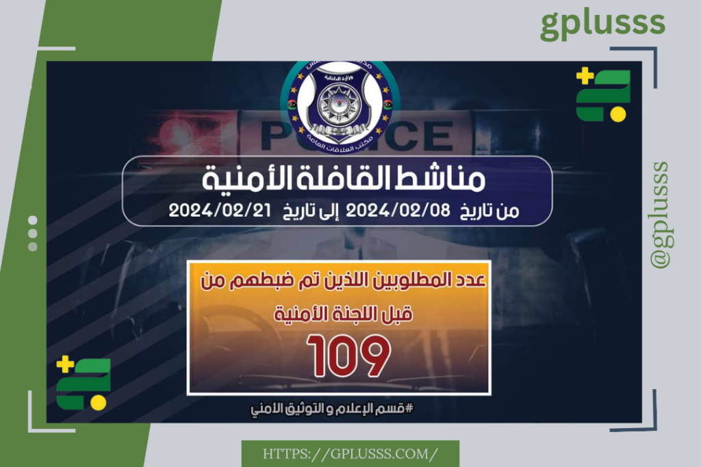 أعلنت مديرية أمن طرابلس أن اللجنة الأمنية تمكنت من ضبط 109 مطلوبا خلال الفترة من 8 فبراير إلى 21 فبراير الجاري.