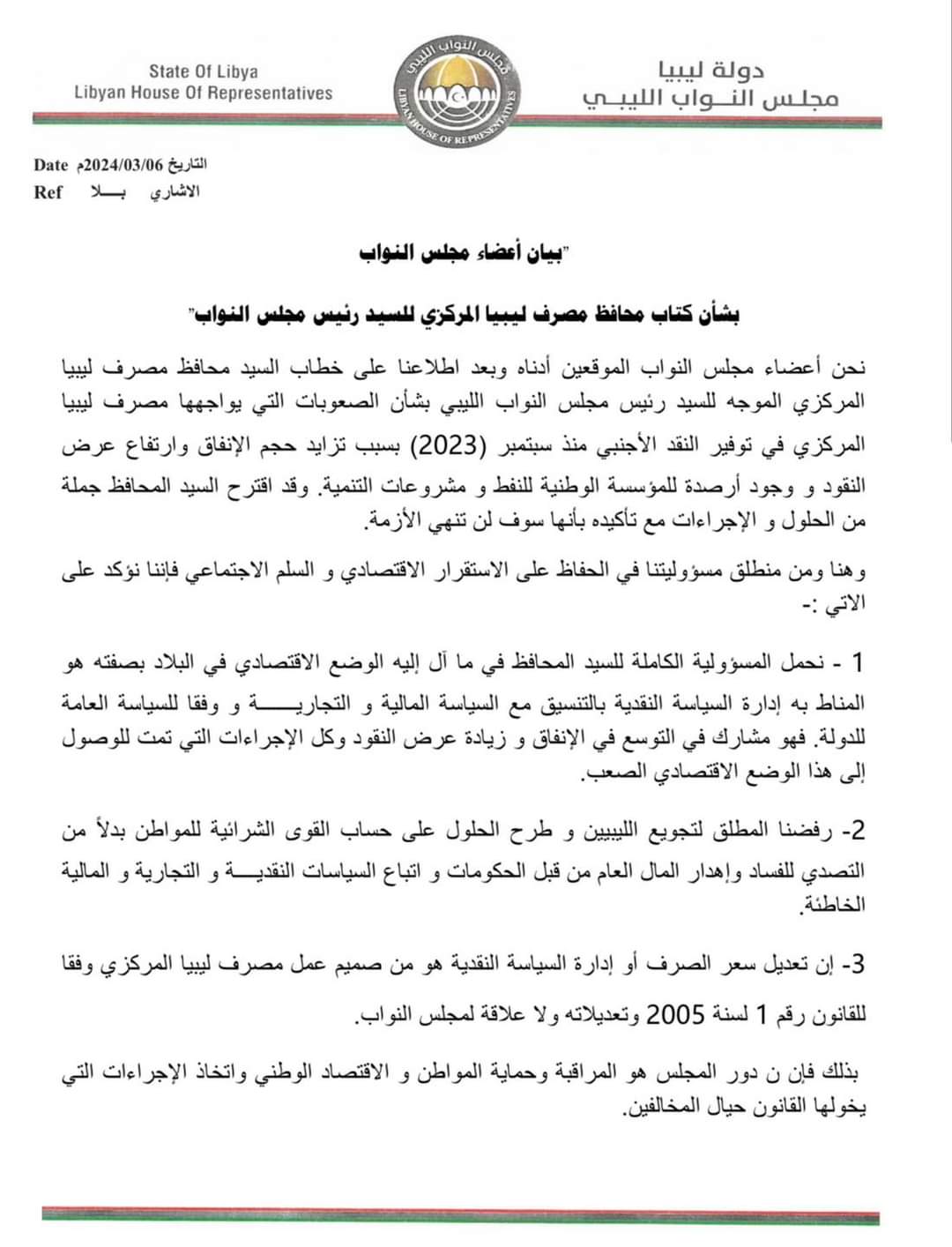 3- إن تعديل سعر الصرف أو إدارة السياسة النقدية هو من صميم عمل مصرف ليبيا المركزي وفقا للقانون رقم 1 لسنة 2005 وتعديلاته ولا علاقة لمجلس النواب. بذلك فإن ن دور المجلس هو المراقبة وحماية المواطن و الاقتصاد الوطني واتخاذ الإجراءات التي يخولها القانون حيال المخالفين
