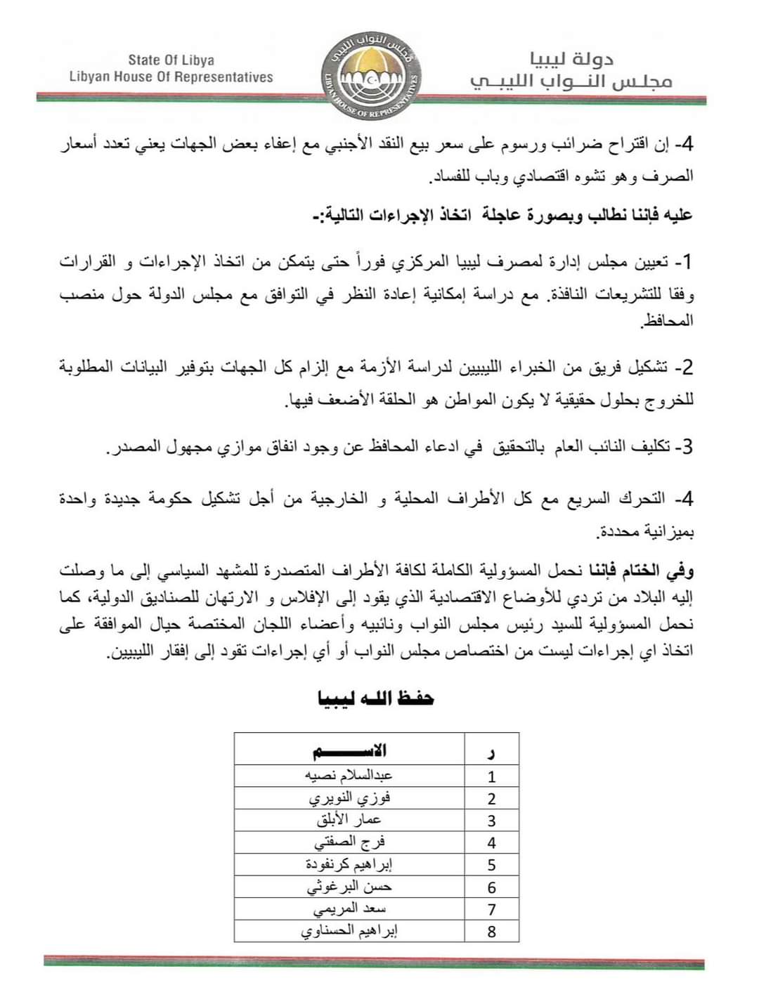وفي الختام فإننا نحمل المسؤولية الكاملة لكافة الأطراف المتصدرة للمشهد السياسي إلى ما وصلت إليه البلاد من تردي للأوضاع الاقتصادية الذي يقود إلى الإفلاس و الارتهان للصناديق الدولية، كما نحمل المسؤولية للسيد رئيس مجلس النواب ونائبيه وأعضاء اللجان المختصة حيال الموافقة على اتخاذ اي إجراءات ليست من اختصاص مجلس النواب أو أي إجراءات تقود إلى إفقار الليبيين.