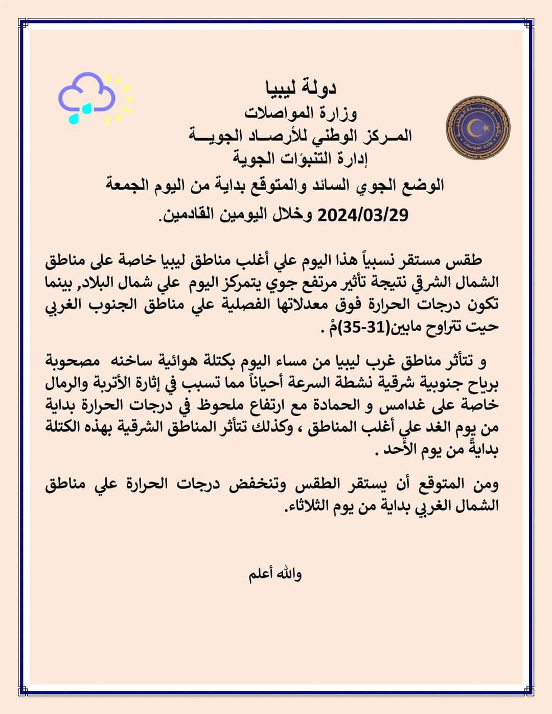 طقس مستقر نسبياً هذا اليوم علي أغلب مناطق ليبيا خاصة على مناطق الشمال الشرقي نتيجة تأثير مرتفع جوي يتمركز اليوم علي شمال البلاد, بينما تكون درجات الحرارة فوق معدلاتها الفصلية علي مناطق الجنوب الغربي حيت تتراوح مابين(31-35)مْ