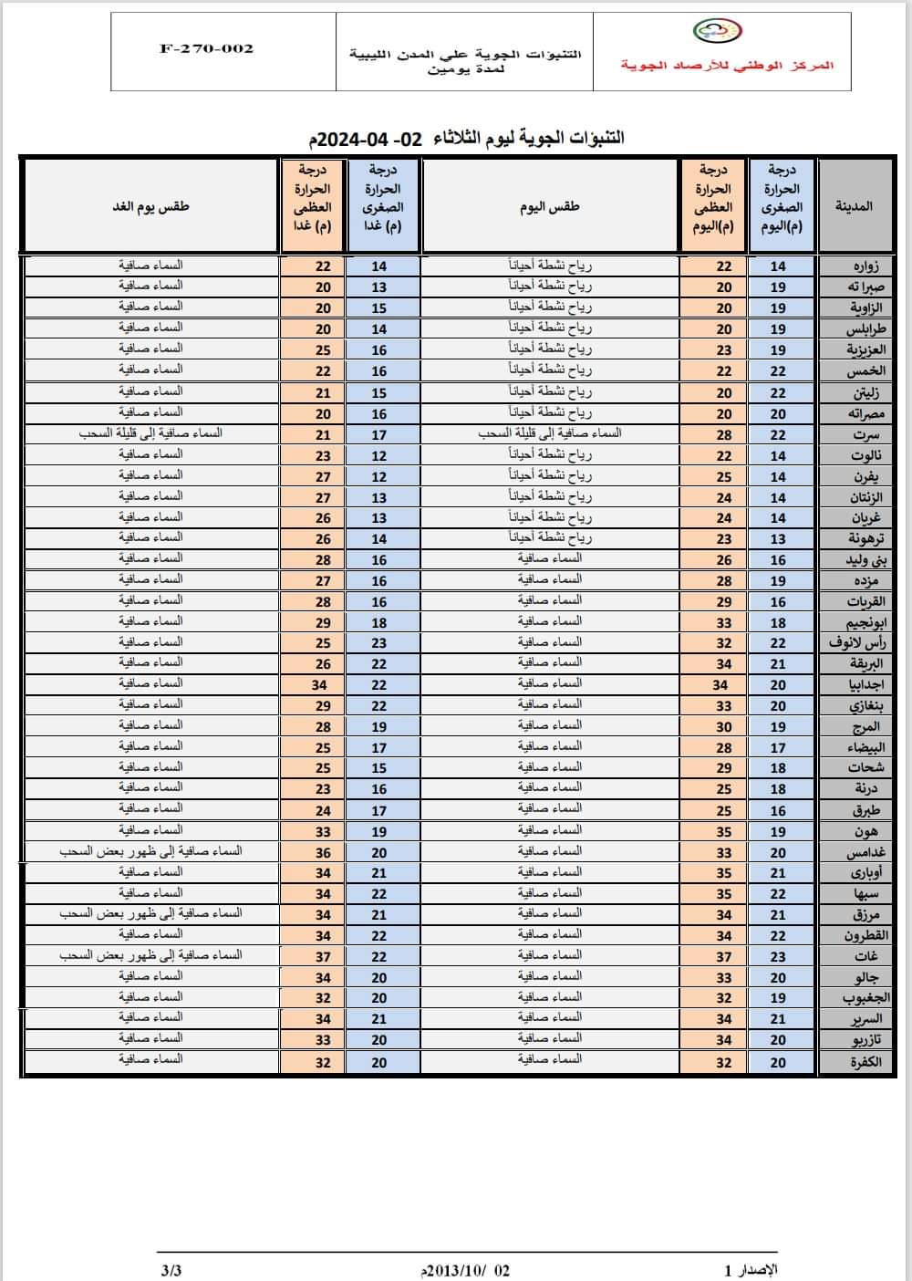 ومن المتوقع ان يشمل الإعتدال في درجات الحرارة من يوم الغد أغلب مناطق الشمال، ومع نهاية الأسبوع أغلب مناطق ليبيا، ويستمر حتى مطلع الاسبوع القادم.