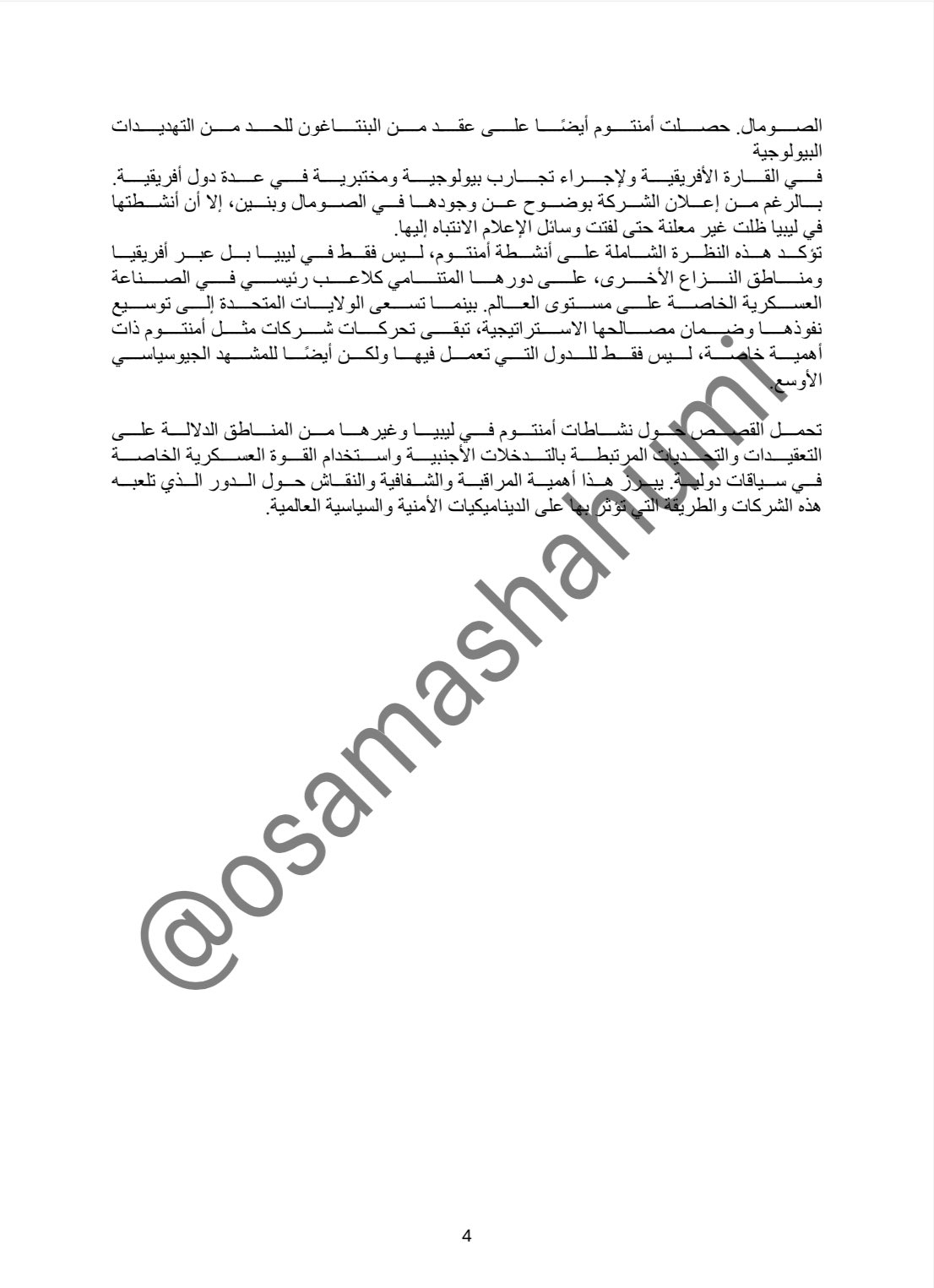 صدرت تقارير تركية وفرنسية وإيطالية، مؤخرا، حول تأثير الشركة الأمنية الأمريكية ”أمنتوم” في ليبيا، ما يبدو معه أن هناك صمتًا رسميًا ملحوظًا من قبل المسؤولين والسياسيين في الجهات التشريعية والتنفيذية والقضائية شرقًا وغربًا.