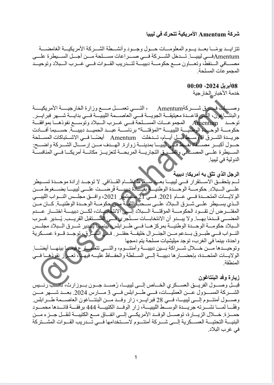 وتشير شركة Amentum على موقعها إلى أنها طورت برنامجا لأفريقيا في عام 2023 نيابة عن وزارة الخارجية. ويظهر وجودها في الصومال وبنين، ولكن ليس في ليبيا. ومع ذلك، سيكون مقر أمنتوم في ليبيا بموجب عقد مع حكومة الدبيبة وسيكون رجالها في قاعدة معيتيغوا العسكرية في طرابلس، التي أصبحت الآن خالية من وجود الميليشيات.