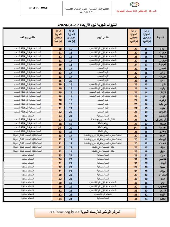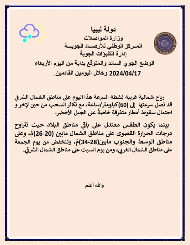 رياح شمالية غربية نشطة السرعة هذا اليوم على مناطق الشمال الشرقي قد تصل سرعتها إلى (60)كيلومتر/ساعة، مع تكاثر السحب من حين لإخر و احتمال سقوط أمطار متفرقة خاصةً على الجبل الأخضر.