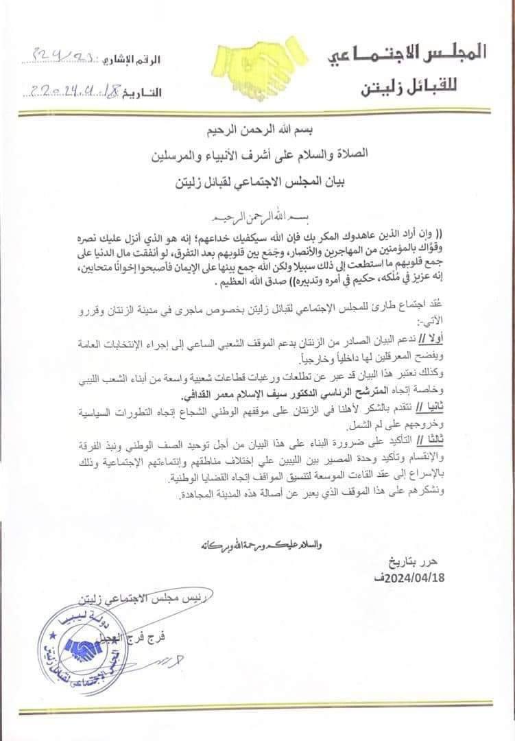 أولا // ندعم البيان الصادر من الزنتان بدعم الموقف الشعبي الساعي إلى إجراء الإنتخابات العامة