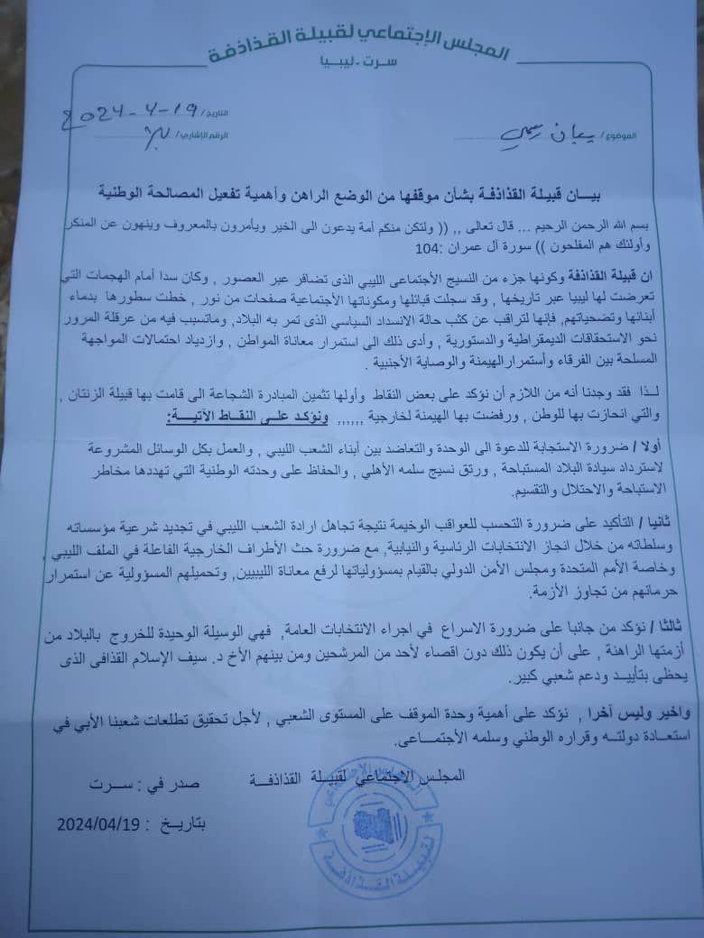 ثمن المجلس الاجتماعي لقبيلة القذاذفة بسرت، مبادرة قبيلة الزنتان لدعم حق الدكتور سيف الإسلام القذافي في الترشح للانتخابات الرئاسية المقبلة، والتي وصفها بالشجاعة، والتي انحازت بها للوطن، ورفضت بها الهيمنة الخارجية.