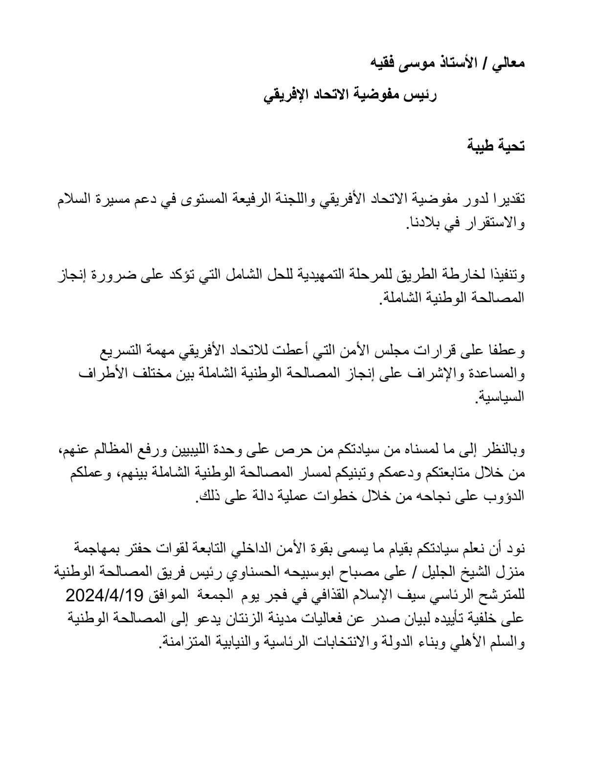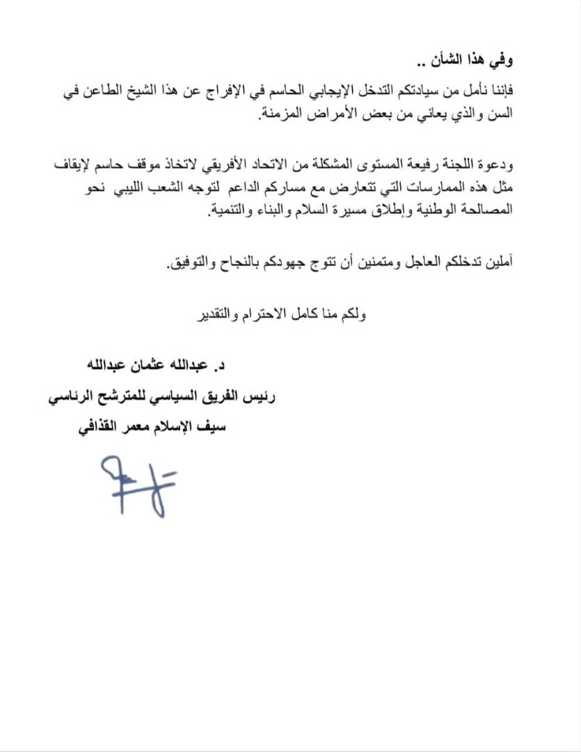 وطالب رئيس الفريق السياسي للمترشح الرئاسي الدكتور سيف الإسلام القذافي، رئيس مفوضية الاتحاد الإفريقي،