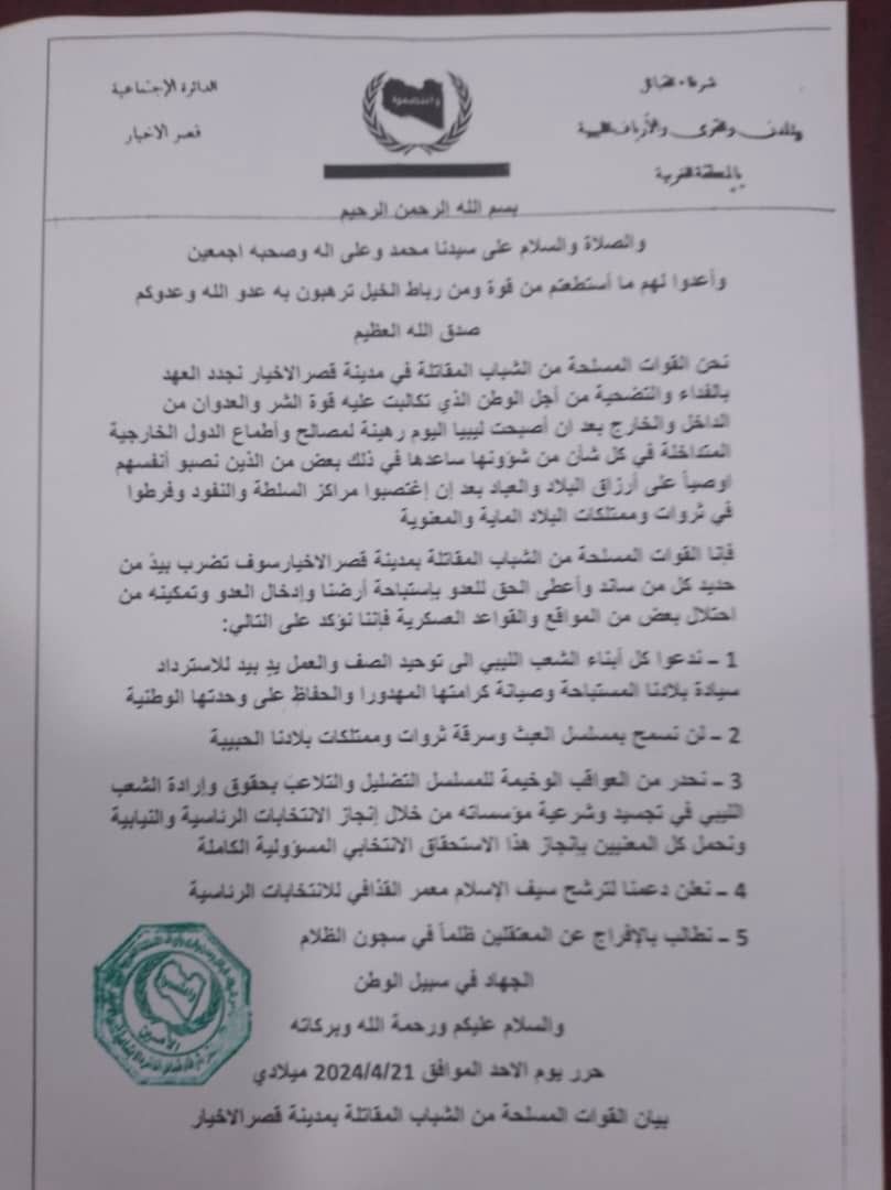 وأكدت القوات من الشباب المقاتلة بمدينة قصر الأخيار، إنها سوف تضرب بيد من حديد كل من ساند وأعطى الحق للعدو باستباحة أرضنا وإدخال العدو وتمكينه من احتلال بعض من المواقع والقواعد العسكرية.