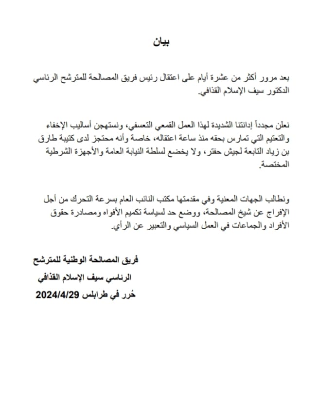 جدد فريق المصالحة الوطنية، التابع للدكتور سيف الإسلام معمر القذافي إدانته للعمل القمعي التعسفي باعتقال الشيخ علي مصباح أبوسبيحة، رئيس الفريق وذلك بعد مرور أكثر من عشرة أيام على اعتقاله.