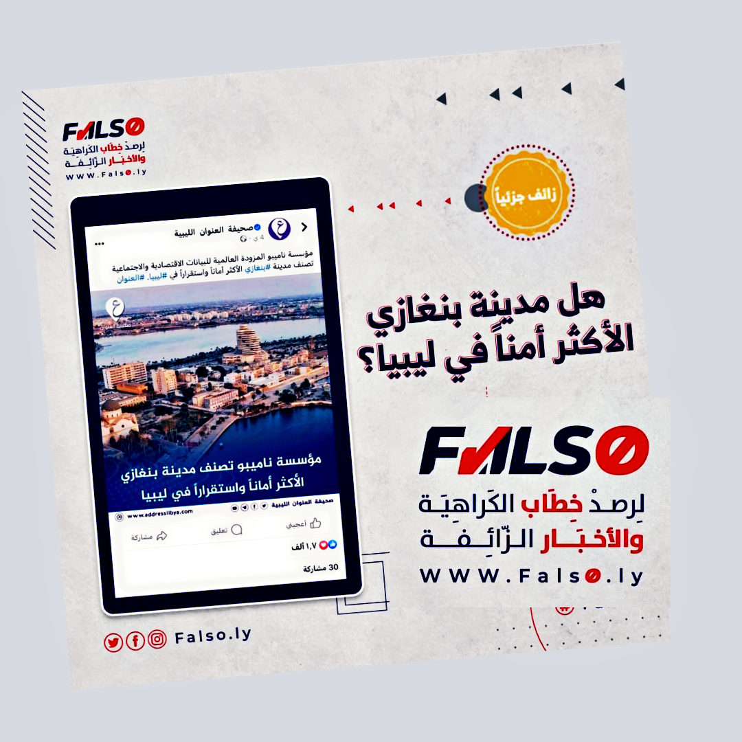 الخبر المنشور على صفحات “العنوان الليبية” تلقفته مؤسسة فالصو لرصد خطاب الكراهية والأخبار الزائفة، لتؤكد أن بنغازي لم تكن أكثر المدن الليبية أمناً وفقا لمؤشر مؤسسة نومبيور للبيانات الاقتصادية.