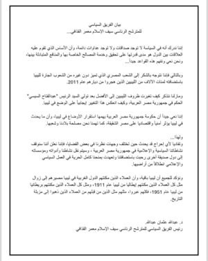 وأكد الفريق الرئاسي للدكتور سيف الإسلام، في بيان له، أنه سيتم نقل النشاط وأدواته ومؤسساته إلى دول صديقة أخرى رحبت باستضافته وتعهدت بمنحه كامل الحرية في العمل السياسي والإعلامي انطلاقًا من أراضيها.