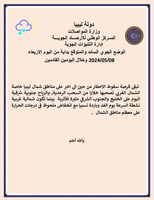 تبقى فرصة سقوط الامطار من حين الى اخر على مناطق شمال ليبيا خاصة الشمال الغربي تصحبها خلايا من السحب الرعدية, والرياح جنوبية شرقية اليوم على الخليج والجنوب الشرقي مثيرة للأتربة بينما تكون شمالية غربية نشطة السرعة يوم الغد وباردة نسبيا مع انخفاض ملحوظ في درجات الحرارة على معظم مناطق الشمال .