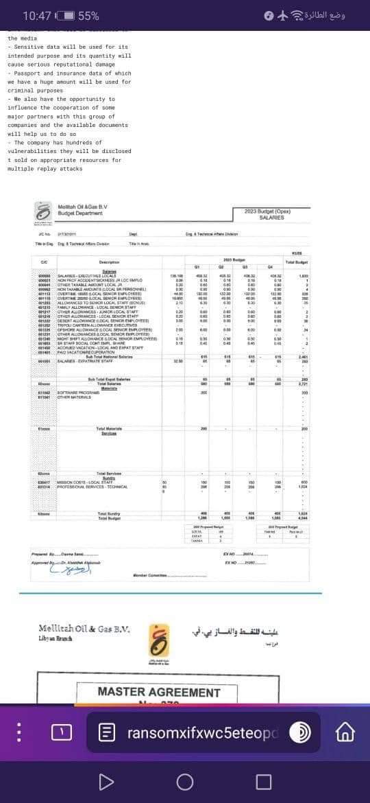 تعرضت شركة مليته للنفط والغاز، وهي شركة إستراتيجية بالشراكة مع شركة إيني الإيطالية لهجوم إلكتروني من قبل هاكر روسي، وتم سرقة تيرابايت من الوثائق الموجودة على خرائط الودائع وبعض العقود والتفاصيل المالية والإنتاجية.