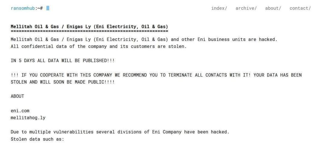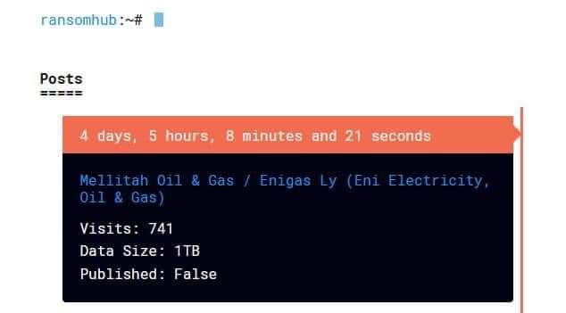 تعرضت شركة مليته للنفط والغاز، وهي شركة إستراتيجية بالشراكة مع شركة إيني الإيطالية لهجوم إلكتروني من قبل هاكر روسي، وتم سرقة تيرابايت من الوثائق الموجودة على خرائط الودائع وبعض العقود والتفاصيل المالية والإنتاجية.