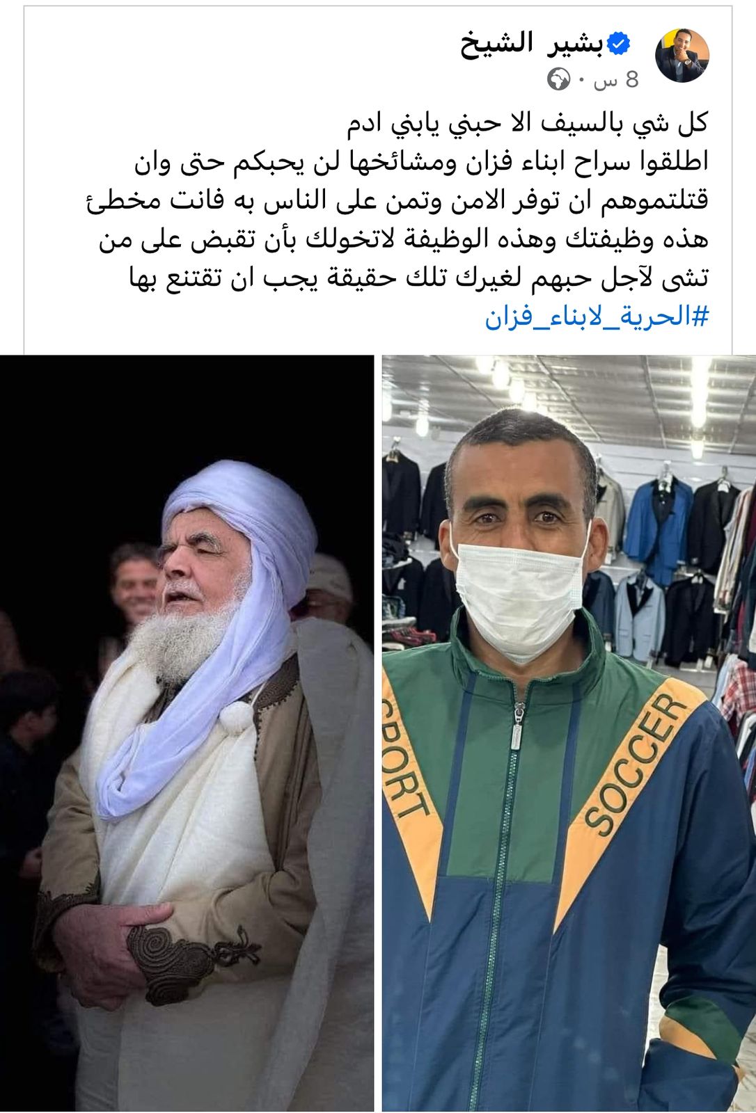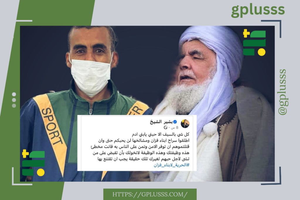 وقال الشيخ، في تدوينه عبر حسابه على فيسبوك: “كل شيء بالسيف إلا حبني يا بني ادم.. أطلقوا سراح أبناء فزان ومشايخها، لن يحبكم حتى وأن قتلتموهم، أن توفر الأمن وتمن على الناس به فأنت مخطي، هذه وظيفتك وهذه الوظيفة لا تخولك بأن تقبض على من تشي لأجل حبهم لغيرك تلك حقيقة يجب أن تقتنع بها”.
