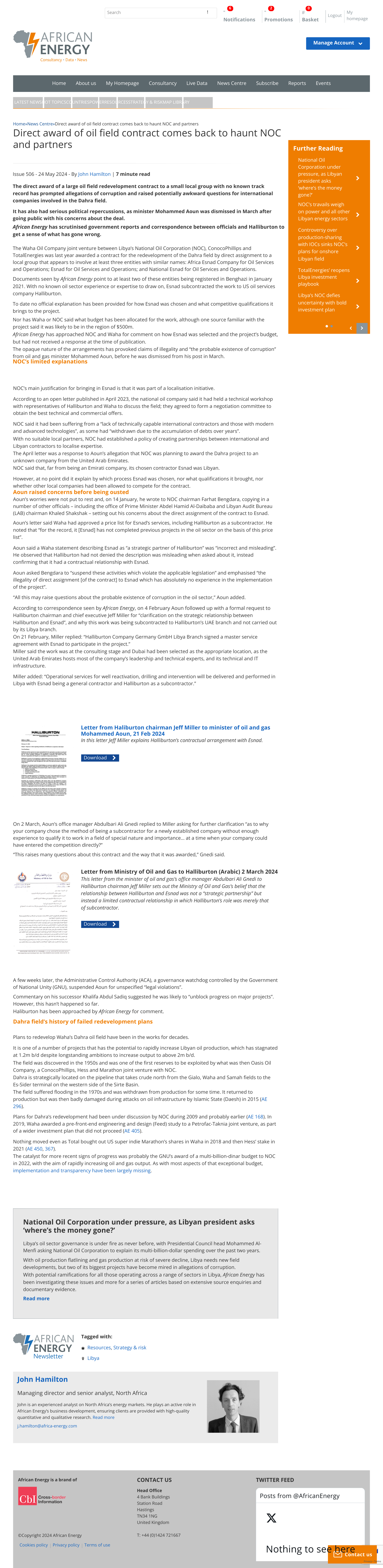 وذكر أن ملف الطاقة الليبي يجمع أهم عناصر هذا التقرير في مكان واحد على موقع الطاقة الإفريقية، موضحا أن الترسية المباشرة لعقد حقل النفط تعود إلى مطاردة المؤسسة الوطنية للنفط وشركائها.