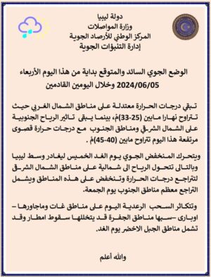 الرياح: شرقية فجنوبية شرقية معتدلة السرعة تنشط على الخليج وبنغازي تتحول تدريجيا من مساء الغد إلى شمالية غربية.
