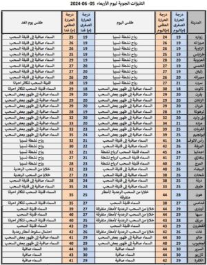 أفاد المركز الوطني للأرصاد الجوية بأنه لا تغير ملحوظ في حالة الطقس على مناطق الشمال الغربي وأقصى الساحل الشرقي، حيث درجات حرارة معتدلة نسبيا، بينما تبقى الحرارة مرتفعة على مناطق الشرق والجنوب لتتراوح مابين (36-45)مْ.
