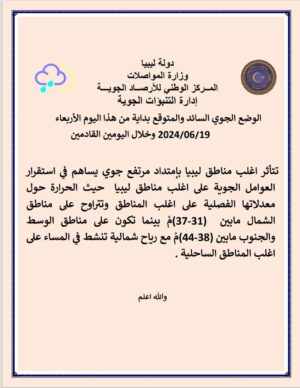 أفاد المركز الوطني للأرصاد الجوية بأن ليبيا تشهد طقسا صيفيا مستقرا على أغلب المناطق، حيث تميل درجات الحرارة للاعتدال على المناطق الساحلية وتتراوح ما بين (27-36)مْ.