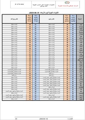 درجات الحرارة القصوى: تتراوح ما بين (30–36)مْ على المناطق الساحلية، ومابين (37-39)مْ على الدواخل.