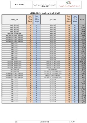 وأفاد المركز في بيان له منذ قليل، أن درجات الحرارة القصوى تتراوح مابين (30-35)مْ على المناطق الساحلية ومابين(38-42)مْ على باقي المناطق، ومن المتوقع أن تبقى الأجواء مستقرة حتى مطلع الأسبوع القادم .