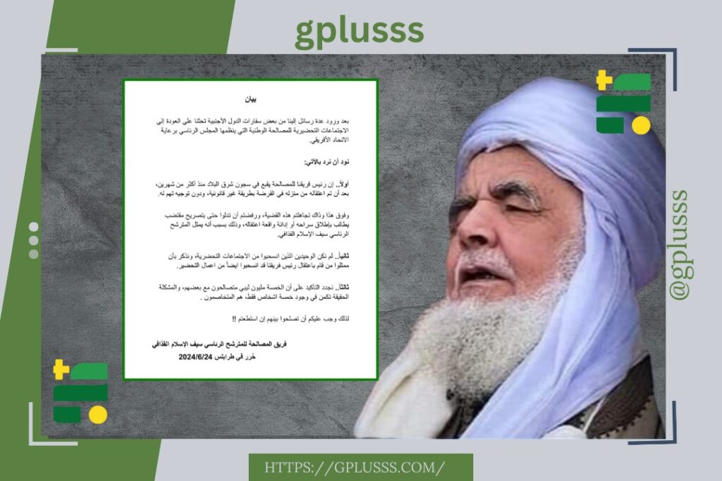أصدر فريق المصالحة التابع للدكتور سيف الإسلام معمر القذافي، بيانًا ردًا على مطالبات سفارات الدول الأجنبية بالعودة إلى اجتماعات المصالحة الوطنية.