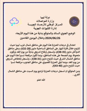 توقع المركز الوطني للأرصاد الجوية اعتدال درجات الحرارة اليوم الأربعاء، على مناطق شمال غرب ليبيا، حيث تتراوح خلال فترة النهار على المناطق الساحلية ما بين (28-32)مْ، وعلى مناطق الدواخل ما بين (35-38)مْ.