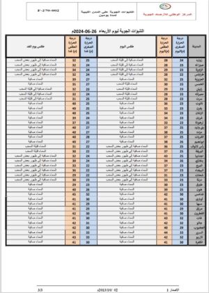 درجات الحرارة القصوى: تتراوح على أغلب المناطق ما بين (31-38)مْ، وتسجل انخفاضا تدريجيا من الغد.