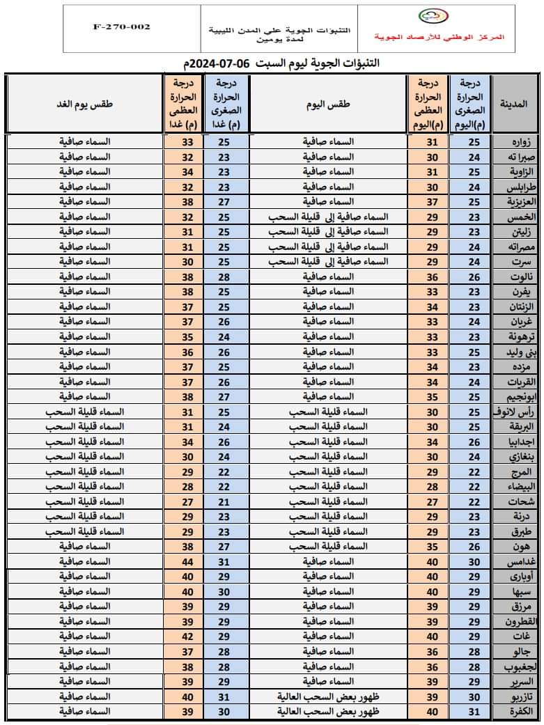 أعلن المركز الوطني للأرصاد الجوية، اعتدال في درجات الحرارة على مناطق الشمال خلال فترة النهار حيث تتراوح على المناطق الساحلية والدواخل ما بين (28-33)مْ، أما في مناطق الوسط والجنوب تكون ما بين (35-40)مْ.