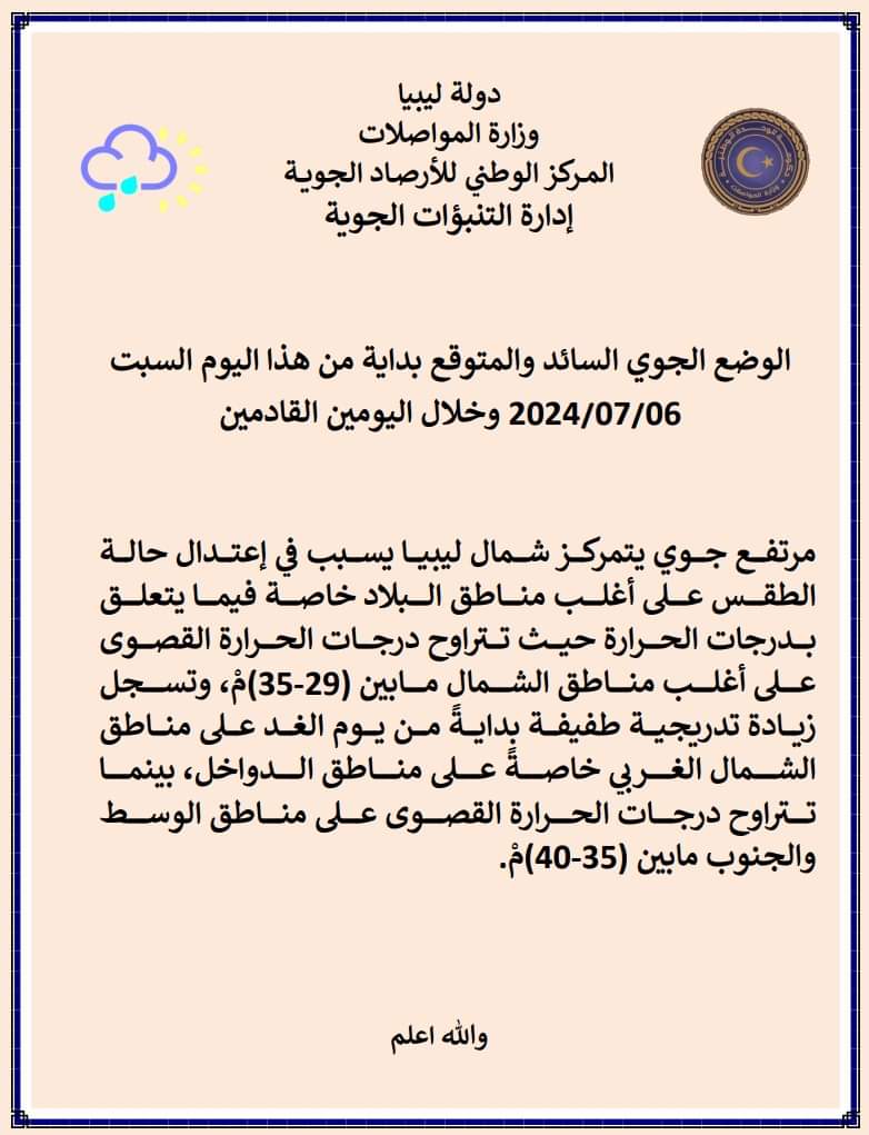 وأفاد المركز الوطني، أنه من المتوقع أن يستمر الطقس دون تغيير حتى بداية الأسبوع القادم مع ارتفاع طفيف في درجات الحرارة ضمن معدلاتها الفصلية لهذا الشهر (يوليو)، مما يبقي الأجواء صيفية معتدلة.