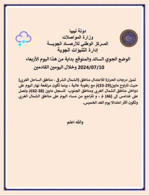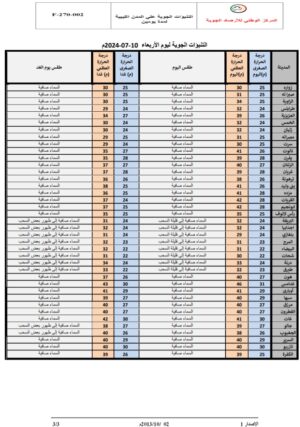 درجات الحرارة القصوى: تتراوح ما بين 30–33مْ على المناطق الساحلية مع رطوبة عالية، وما بين 38-42مْ على الدواخل وتسجل تراجعا تدريجيا من مساء اليوم على اغلب المناطق.