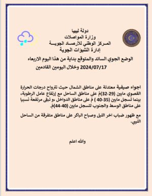 أفاد مركز الأرصاد الجوية بأن ليبيا تشهد اليوم الأربعاء، أجواء صيفية معتدلة على مناطق الشمال، مع ارتفاع عامل الرطوبة.