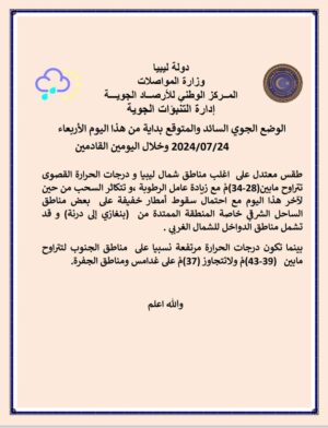 أفاد مركز الأرصاد الجوية بأن طقس اليوم الأربعاء، معتدل على أغلب مناطق شمال ليبيا ودرجات الحرارة القصوى تتراوح ما بين 28-34مْ مع زيادة عامل الرطوبة.