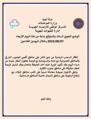 حالة السماء: تكاثر للسحب الرعدية من حين لآخر على أقصى الجنوب الشرقي (المناطق الحدودية مع تشاد والسودان) مع فرصة هطول أمطار جيدة من مساء اليوم قد تكون غزيرة عليه اخذ الحيطة والحذر، وقد تشمل فرصة أمطار متفرقة على أقصى مناطق جنوب الكفرة.
