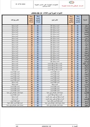 درجات الحرارة القصوى: تتراوح على المناطق الساحلية ما بين 31–34مْ وما بين 35–38مْ على الدواخل، مع رطوبة عالية نسبياً على المناطق الساحلية، وتسجل زيادة طفيفة يوم الغد.