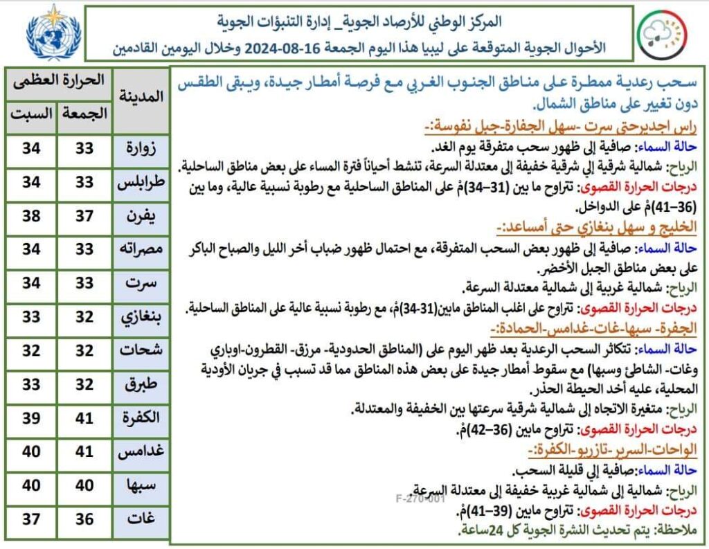 أفاد مركز الأرصاد الجوية باستمرار بتكاثر السحب الرعدية الممطرة من حين لأخر من مساء اليوم الجمعة 16/08/2024 ويوم السبت على مناطق الجنوب الغربي (المناطق الحدودية مع دولة النيجر والجزائر – القطرون- مرزق-اوباري- غات – الشاطى – واحتمال أن تصل لسبها) تكون فرصة الأمطار جيدة على بعض هذه المناطق مما تسبب في جريان بعض الأودية المحلية.