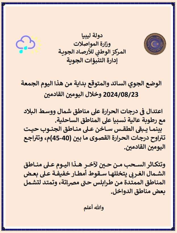 أفاد مركز الأرصاد الجوية باعتدال في درجات الحرارة نهارا على أغلب مناطق الشمال مع رطوبة عالية نسبيا خاصة على المناطق الساحلية ، ويشمل الاعتدال بعض مناطق الوسط ( غدامس والحمادة – الجفرة) .