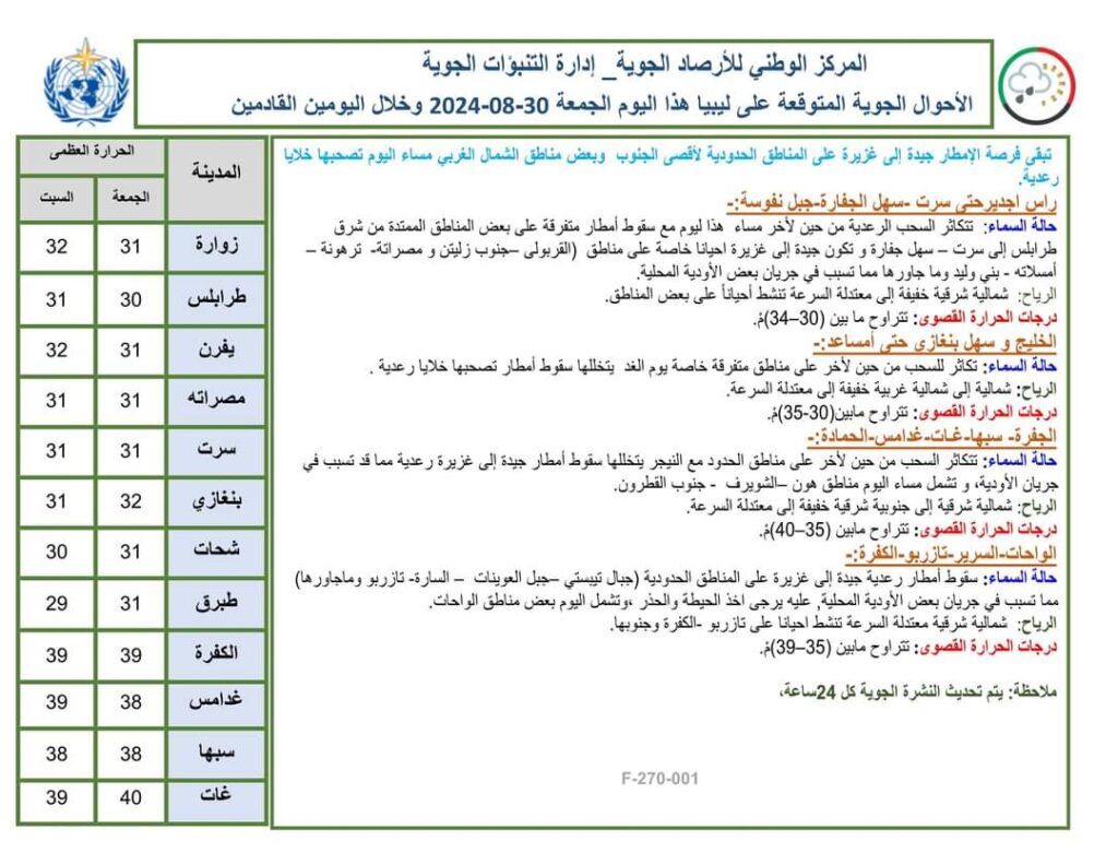 حالة السماء: سقوط أمطار متفرقة يتخللها خلايا رعدية على بعض المناطق الساحلية الممتدة من الزاوية إلى سرت ومناطق الجبل خاصة غريان- مزدة- نسمة- ترهونة – امسلاته- بني وليد وما جاورها، تكون جيدة على بعض مناطق الدواخل مما تسبب في جريان بعض الأودية المحلية .