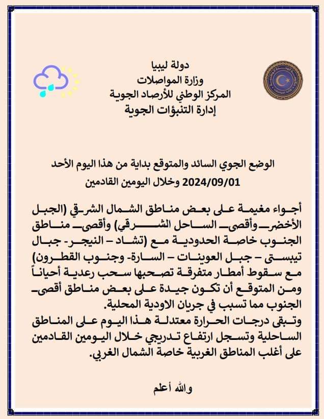 حالة السماء: تتكاثر السحب من حين لآخر مع احتمال سقوط أمطار خفيفة على الجفرة و الشويرف ومن المتوقع أن تكون جيدة تصحبها خلايا رعدية على المناطق الحدودية مع (تشاد والنيجر) وجنوب القطرون مما قد تسبب في جريان بعض الأودية.