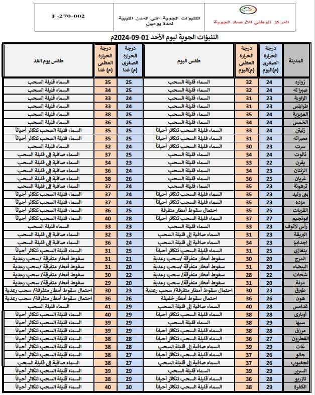 درجات الحرارة القصوى: تتراوح مابين (36–40)مْ، وتسجل ارتفاع تدريجي من يوم الغد على غدامس والحمادة.