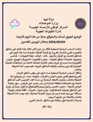 حالة السماء: تتكاثر السحب الرعدية فترة المساء على مناطق أقصى جنوب الجبل والقريات- ترهونة- مزده – بن وليد؛ يتخللها سقوط أمطار متفرقة تكون جيدة إلى غزيرة أحيانا، مما تسبب في جريان بعض الأودية المحلية، وتشمل الأمطار الرعدية مساء الغد أغلب المناطق.