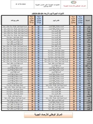 الرياح: شمالية إلى شمالية غربية سرعتها بين الخفيفة والمعتدلة.