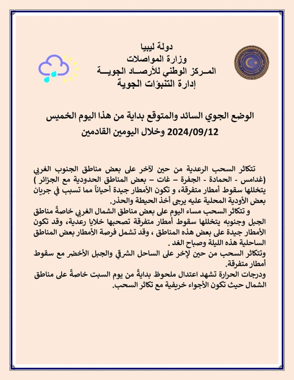 حالة السماء تتكاثر السحب من حين إلى أخر يتخللها سقوط أمطار متفرقة خاصة يوم الغد على مناطق (الجفرة – غدامس–سبها- الشاطئ –اوباري – مرزق -غات) تصحبها خلايا رعدية احيانا، مما تسبب في جريان الأودية المحلية.