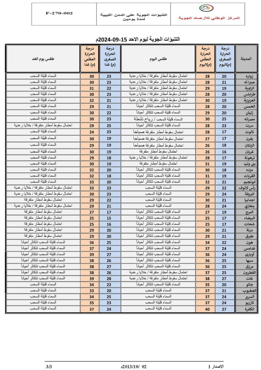 حالة السماء: تتكاثر السحب الرعدية الممطرة مساء اليوم خاصة على مناطق ( غات وماجاورها-اوباري وجنوبها –حوض مرزق –سبها وجنوبها –الهروج-الفقها) و تكون جيدة إلى غزيرة أحيانا مما تسبب في جريان الأودية .