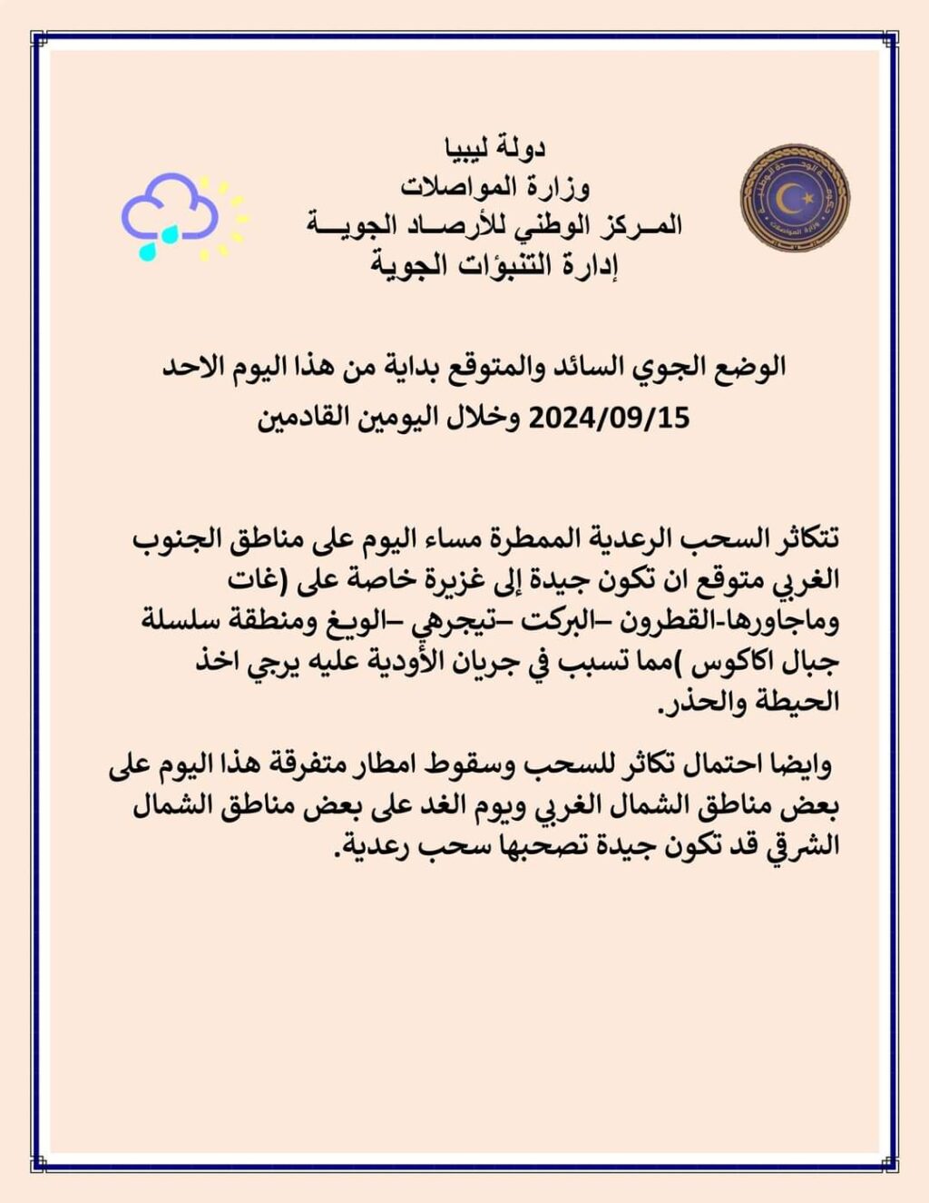أفاد المركز الوطني للأرصاد الجوية، بسقوط أمطار رعدية مساء اليوم الأحد 15 سبتمبر 2024 على بعض مناطق الجنوب الغربي متوقع أن تكون جيدة إلى غزيرة خاصة على ( القطرون – الويغ – تيجرهي – غات – البركت – سلسلة جبال اكاكوس) مما تؤدى جريان الأودية وحدوث سيول خاصة من الداخل الجزائري (جانيت)باتجاه المناطق الليبية الحدودية والمناطق المذكورة، يصحب هذه الوضعية رياح هابطة نشطة إلى قوية.