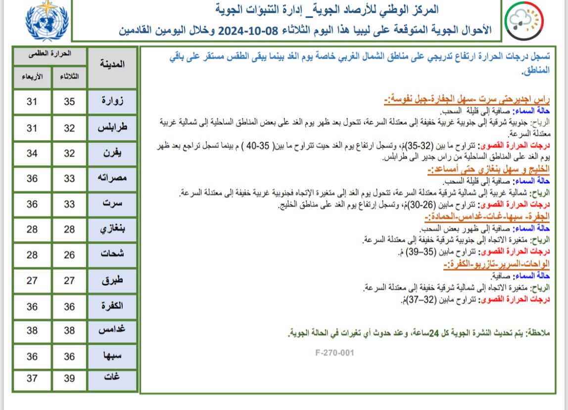 توقع مركز الأرصاد الجوية أن تسجل درجات الحرارة ارتفاعا تدريجيا بداية من اليوم الثلاثاء 8 أكتوبر على مناطق الشمال الغربي– غدامس والحمادة.