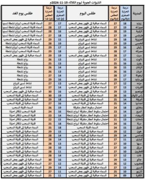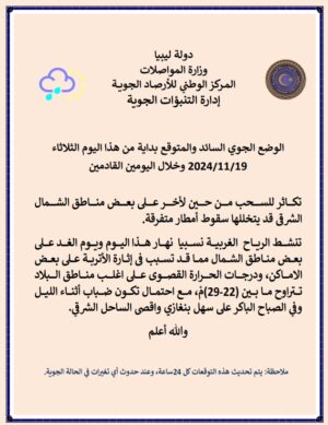 حالة السماء: قليلة السحب تتكاثر أحيانا خاصة على المنطقة الممتدة من المرج حتى درنة قد يتخللها سقوط أمطار متفرقة، مع احتمال ظهور ضباب أثناء الليل وفي الصباح الباكر على مناطق سهل بنغازي وأقصى الساحل الشرقي.